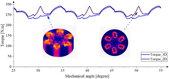 Figure 24. Comparison of torque production with three-dimensional and two-dimensional FEA at 2600 RPM with conduction angle −47.9° and 125°, and reference current of 200 A.