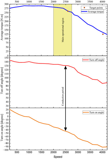 The motor performance at different speed conditions is investigated by optimization of control parameters. In Figure 25, the torque-speed characteristics and the optimized turn-on and turn-off angles are presented. Based on the LSA load characteristics, the motor speed is mainly limited to the region highlighted as the main operational region in Figure 25. The torque required for critical speed points of 2600 rpm and 4000 rpm are achieved.