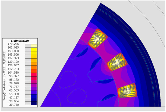 A water jacket is considered for the LSA motor with a 50/50 water–glycol coolant. A finite element model is developed to analyze the performance of the thermal management system. The convection coefficients and boundary conditions are selected based on the thermal management system constraints [33]. Table 9 shows the coefficients used in the thermal model. Some additional simplifications are also considered, such as neglecting endcap cooling to reduce the model complexity. Figure 26 shows the results for the steady-state thermal analysis at the base speed and the maximum continuous power. The maximum temperature within the stator slot area is 170.2 °C, which is below the temperature limit of the materials.