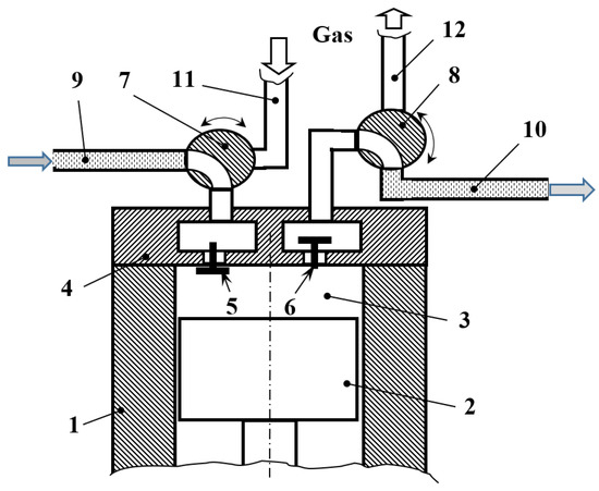 Schematic diagram of PHPM with regenerative heat exchange (1—cylinder; 2—piston; 3—working chamber; 4—valve head; 5—suction valve; 6—discharge valve; 7, 8—three-way valves; 9—liquid suction line; 10—liquid discharge line; 11—gas suction line; 12—gas discharge line).