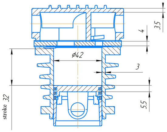 The low-capacity single-cylinder compressor DECO DKAC09AIR was taken as a basis design in the present study. Figure 2 shows the section of its cylinder–piston group. This compressor is air-cooled and has a cylinder–piston group with a seal and a strainer of O-rings.