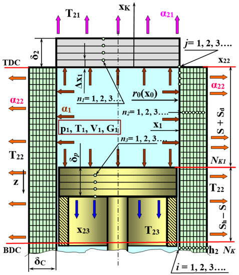 The unsteady heat transfer in the cylinder–piston group is governed by the heat diffusion equation that should be taken without internal heat sources [29]:
