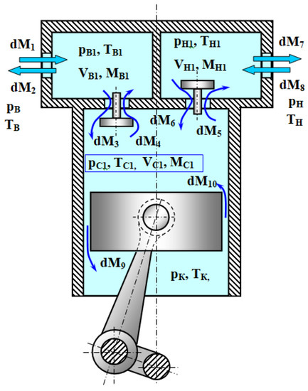 The governing equations of the lumped thermodynamic model incorporate the energy conservation equation (the first law of thermodynamics) for the gas, which has a variable volume and mass; the mass conservation equation; the equation of chamber volume variation due to piston motion; the equation for the dynamics of self-acting valves; the equation for a perfect gas state. This system of equations is written for three control volumes (see Figure 5)—that of the intake chamber, compression chamber, and discharge chamber: