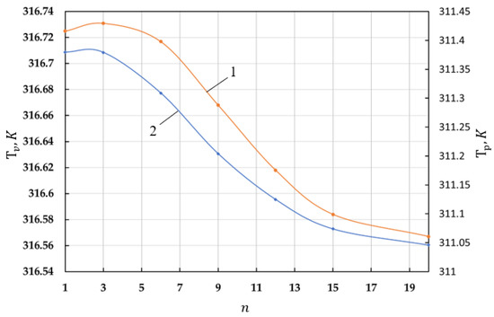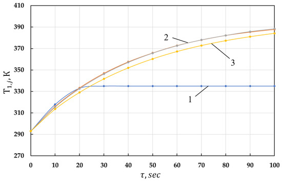 Figure 6 shows the temperature of the inner surface, , as a function of time obtained by selecting different values for S and ∆τ1. It is seen that selection S = 224 shows an initial growth in the surface temperature to 332 K followed by the subsequent maintenance of this value. This trend is drastically different from the results of the ANSYS computation, which is probably due to the insufficient numerical accuracy of the tridiagonal matrix algorithm. A reduction in S leads to a convergence between the tridiagonal matrix algorithm and the finite element solution. The divergence between the results remains in the interval 4 to 5 K.