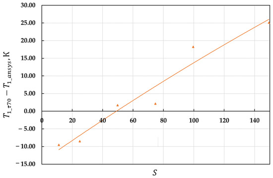 The dependence of the temperature divergence, ∆T, between the tridiagonal matrix and finite element methods on the parameter S was studied is shown in Figure 7. It is seen that the optimal value of S should be in the range between 40 and 60 W/s∙K. Smaller values of S lead to faster but less accurate computation.