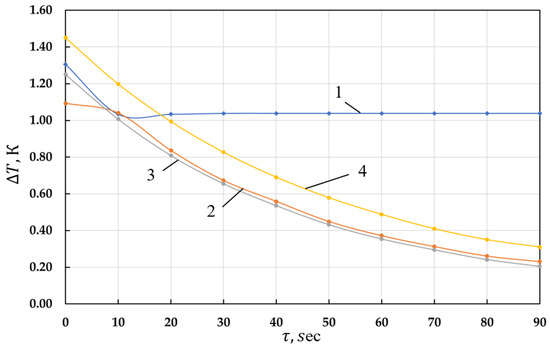 Dependence of temperature difference between inner and outer surfaces of the plate on time (1: S = 224; 2: S = 22.42; 3: S = 11.21; 4: ANSYS).