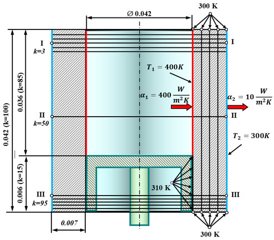 It is required to distinguish three zones along the cylinder wall in order to impose the boundary conditions (see Figure 4): (I) internal surface of the cylinder between its head and the upper surface of the piston; (II) contact region between the cylinder and the piston; (III) the cylinder surface below the piston.