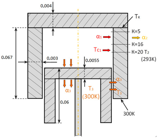 A simplified problem focused specifically on the unsteady heat transfer is considered in this section, namely an infinite plate of thickness, . The following third-kind boundary conditions are imposed on the plate: α1 = 400 W/m2K, T1 = 400 K; α2 = 10 W/m2K and T2 = 293 K. The number of nodes in the tridiagonal matrix algorithm was selected as i = 20, and the spatial resolution was ∆x = 0.00025 m.