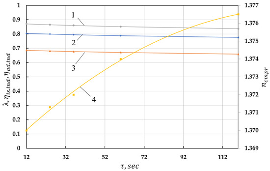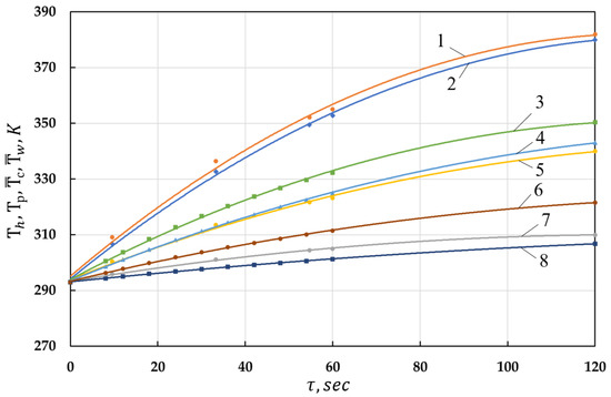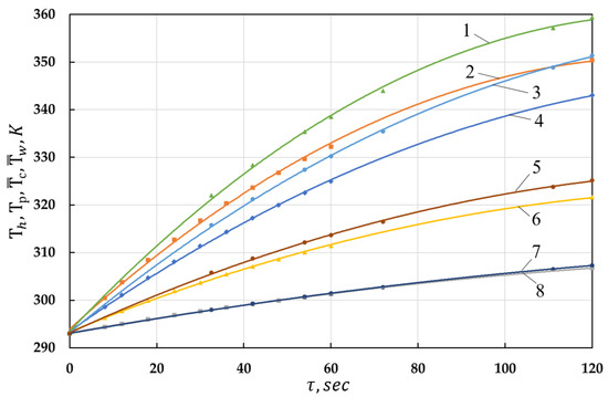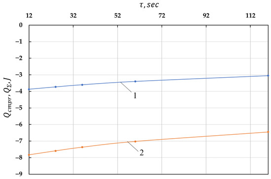 During the time interval τ1, the PHC works in the compressor mode. In this case, the walls of the working chamber are heated from the initial temperature to a certain limiting temperature due to the removal of the gas compression heat. Accumulation of the thermal energy in the chamber walls leads to the reduction of the compressor efficiency. When a certain wall temperature is reached after time interval τ1, the PHC switches the operation mode from a compressor to a pump. In the pump mode, the parts of the cylinder–piston group are intensively cooled by the pumping liquid during the time interval τ2. Then, the studied system returns to the compressor mode and the cycle repeats.