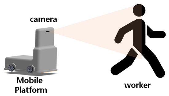 This study proposes a method of operating a Mecanum wheel-based mobile (MWR) robot applied to a smart factory logistics system. As shown in Figure 1, the proposed system consists of an image sensor attached to the mobile robot to recognize the fiducial marker (ArUco marker) printed on the rear side of the worker’s vest, a module that estimates the relative position of the marker through the recognized ArUco marker, and a motion control module to move the mobile robot to the estimated position.