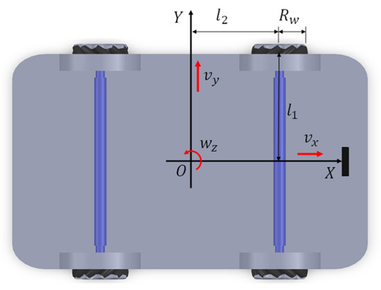 The MWR is a mobile platform in which the Mecanum wheels are connected to four independent drive motors and can move in all directions through the combined force generated by each wheel. The velocity equation of the MWR can be calculated by [26]