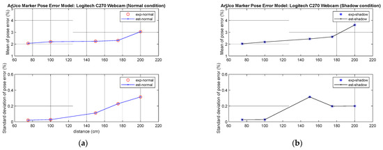 While the mobile robot follows the worker, the relative distance between the robot and the worker changes. Since this change in distance is caused by errors in position estimation according to the relative distance from the image sensor to the ArUco marker, this aspect is analyzed to generate gait data that closely represent reality. In [30], the percentage error and standard deviation when using the Logitech C270 Webcam were investigated, as shown in Table 1, under the measurement conditions of with and without shadow.