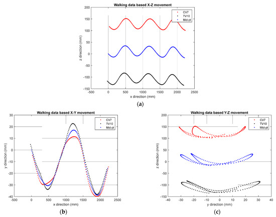 Analysis of marker movement according to straight walking: (a) X–Z directional movement; (b) X–Y directional movement; (c) Y–Z directional movement.