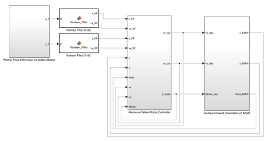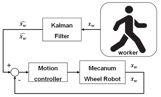 As shown in Figure 6, the estimated value of the worker’s position, calculated and processed by the Kalman filter, was used as a reference value for the mobile platform to follow the worker. In this study, the worker-tracking performance was improved by simultaneously considering the position and the moving speed calculated and processed by the Kalman filter. Figure 7 shows the control structure of the Mecanum wheel-based mobile robot.