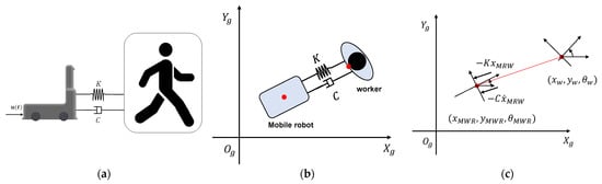 where and represent the linear velocity and angular velocity of the mobile robot, respectively. For the control of the mobile robot, the linear velocity and angular velocity shown in Equations (14)–(16) must be defined. In this study, to define the linear velocity of the mobile robot, it was assumed that both the worker and the mobile platform were a point mass and that a virtual spring and damper existed between the two objects, as shown in Figure 8. Figure 8b,c shows the vertical view of the worker and mobile robot. In Figure 8c, and represent the position of the mobile platform and the worker, respectively. The distance error and speed error were calculated through the error dynamics model for the relative motion of the robot and the worker, as shown in Figure 8:
