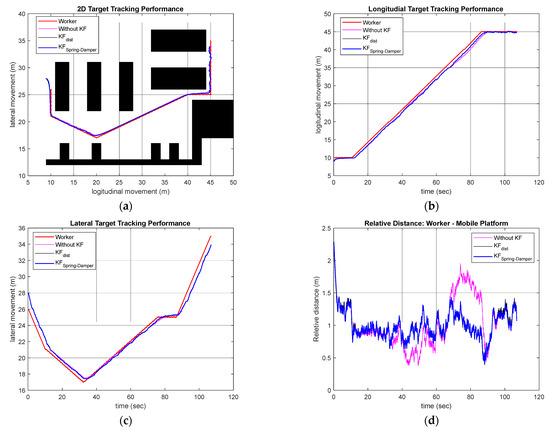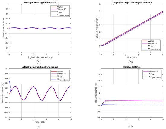 Worker-following performance: (a) 2D plane worker-following performance; (b) Longitudinal direction performance; (c) Lateral direction performance; (d) Target-tracking performance (relative distance).