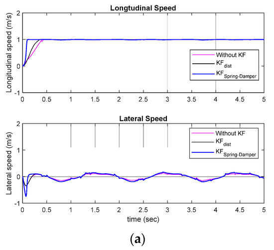 Among the three control methods, the first method was a simulation in which the movement of the worker on the X–Y plane was followed and controlled without Kalman filter-based signal processing. When the worker’s position derived from the gait model passed through the Kalman filter, the position information and speed information that had passed through the filter could be obtained. In the second simulation, the worker was followed based only on the position information, and in the third simulation, the speed of the mobile robot was controlled by simultaneously utilizing the position and speed information of the worker, as suggested in Section 5.