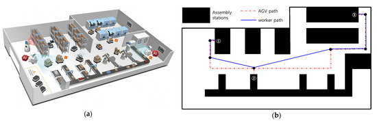 For a more practical application case for the developed algorithm, a worker-following robot scenario in the assembly line of a smart factory was designed. Figure 11 shows a conceptual diagram of a smart factory introduced in an online article [33] related to smart factories. The environment presented in Figure 11 is a smart factory with complete autonomy. However, this study assumed a work site in which humans and robots collaborated. In other words, the robot’s role was to carry heavy objects while following the worker. For the simulation scenario, it was assumed that a worker moved sequentially from workstation ① to ② to ③. In the case of the existing AGV, the robot moved along the red line in Figure 11b, but in the case of a human, it was assumed that the robot moved along the blue line for the efficiency of the travel path. Accordingly, the robot followed the blue line by following the worker ahead.