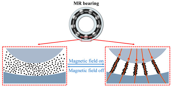 Magnetorheological (MR) material [1,2] has been widely applied in various fields for decades. It can be classified into several types, such as MR fluid [3] (MRF), MR elastomer [4,5,6] (MRE), and MR grease [7] (MRG). Among them, MRG is suitable in dynamic situations such as bearings due to its low fluidity, and it shows a great MR effect in terms of controllable viscosity and the yield stress. With the presence of a magnetic field, the MR effect of the MRG is characterized by rapidity, continuity, reversibility, and low energy consumption. The MRG mainly consists of three components: ferromagnetic particles (e.g., iron powders), base fluids (e.g., grease and oil), and additives for stabilization. The principle of the MR effect lies in the rearrangement of microscopic particles under a changing magnetic field. Without a magnetic field, iron powders are suspended randomly and nondirectionally in the base fluid. However, when exerting a magnetic field on the MRG, the iron powders are arranged along the direction of the magnetic induction lines and form the shape of chains or columns, which greatly increases its viscosity and damping coefficient. The mechanism of the MR effect for the other MR materials (MRE and MRF) is identical. Currently, MR materials are widely used in many fields, including linear MR dampers [8,9,10,11] and rotary MR dampers [12,13].