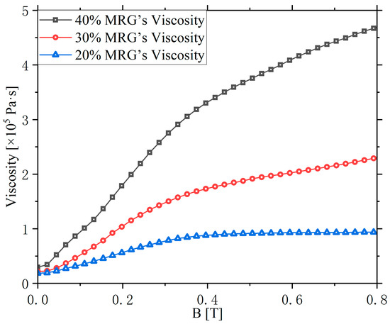Experimental measurements of the viscosity of the MRGs from top to bottom are 40%, 30%, and 20%. The magnetic field varies from 0 T to 0.8 T, and the shear rate is 0.01 s−1.