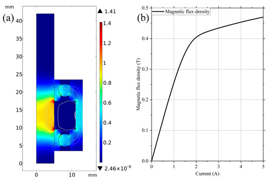 The variable range of the magnetic field provided by the electromagnet coils is also essential for the MR damper. Measuring the magnetic flux density through a Gaussmeter would be more accurate. However, setting a Gaussmeter for measuring was difficult because of the lack of space for sensors. Therefore, the relationship between the magnetic flux density and the current input was built via magnetic simulation. The magnetic field analysis was conducted in COMSOL software.