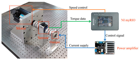 The experimental platform designed to measure the torque of the MR damper is presented in Figure 5. It is mainly composed of three parts. A servo motor with a rated torque reaching 10 Nm lies on the left side. The device in the middle is a torque sensor with a measuring range of 30 Nm and an accuracy of 0.1%. It outputs an analog voltage signal, which is convenient for data acquisition and analysis. The MR damper is placed on the right side. These devices are fixed onto the optical platform through aluminum alloy brackets. They are connected by diaphragm couplings to keep the flexible link. Acquisition of torque data and generation of control signals for the motor and the current in the coil are achieved by a controller (myRIO-1900, NI Co., Austin, TX, USA). During the experiment, myRIO controlled the rotation speed of the motor, and the motor drove the rotation axis connected with the MR damper. The torque sensor measured the rotational torque transmitted on the axis and delivered it to the myRIO. The damping force was adjusted through the current in the coil, which was controlled by the output signal of the myRIO.