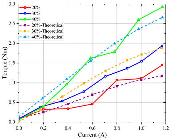 Theoretical torque is calculated with (4) in Section 3. The empirical constants μB and K0 are shown as follows: μB = −0.01785, K0 = 5.048 × 10−9. These constants were substituted in (4) to calculate the theoretical torque, which was compared with the experimental torque in Figure 6. The fitting parameters for the coefficient of determination are R2 = 0.9571 and adjusted R2 = 0.9470, which indicates that the fitting process is successful with (4).