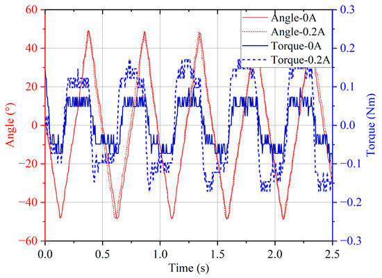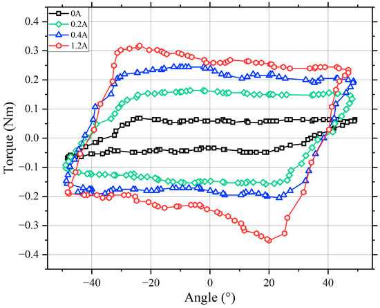 Torque–angle curve with different currents: the currents are 0 A, 0.2 A, 0.4 A, and 1.2 A.