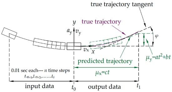 Before training, we know the true values of µx and µy at each step in the data set; when the training coefficients are anet, bnet, and cnet, the true yaw rate coefficients at, bt, and ct are obtained by calculating the true values of µx and µy at every step. Corresponding to each step, there is a set of µx and µy, which contains the next n (number of steps in the neural network) steps µx and µy. Through this set, combined with (1), the true values of at and bt can be obtained by the polynomial regression [26] fitting function and the true value of ct can be obtained by the linear regression [27] fitting function.