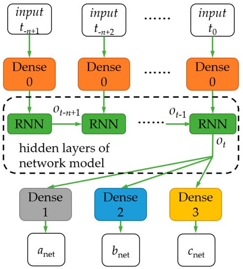 After the hidden layer calculation, the output of the hidden layer ot is used for three other different dense layer operations (Dense1, Dense2, and Dense3), used to generate 3 coefficients as the output: anet, bnet, and cnet. The 3 coefficients are obtained by performing linear operations on the output ot of the last time step.