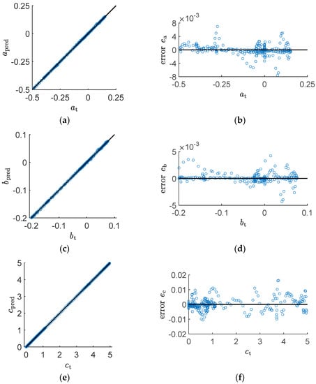 Each coefficient has a different value range; both the true value and the mean square error loss of the coefficient are very small. Therefore, it is necessary to normalize coefficients during training [28]. For normalization, when at, bt, and ct are used for training, they are weighted with λa = 1000, λb = 10,000, and λc = 1, respectively. In order to minimize the loss, the anet, bnet, and cnet training targets are the values obtained after multiplying the true coefficients at, bt, and ct by λa, λb, and λc, respectively. The mean square error loss of anet, bnet, and cnet for the training is as follows: