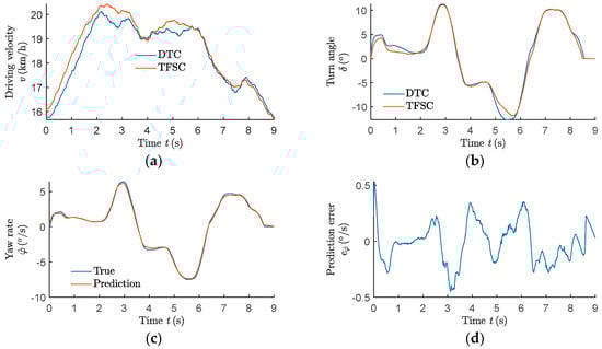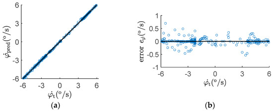 The yaw rate and its error calculated from the prediction results are shown in Figure 6. φt was obtained by calculating the true yaw rate coefficients at, bt, and ct.