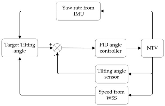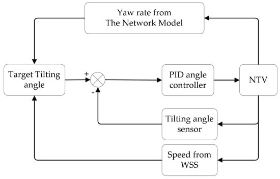 Many methods have been proposed to solve this problem. Claveau et al. [10,11] found that controlling the actuators of active tilting motion and yaw motion based on the driver’s steering wheel angle feedback can reduce the response lag of the tilting angle and designed a nonlinear control method. Nguyen et al. [5] proposed a linear variable parameter control method based on the feedback of vehicle motion states, such as driving velocity and yaw rate, to reduce the error of the tilting angle in the process of yaw motion. Tang et al. [12,13,14] studied the NTV dynamic of rollover critical conditions. A roll index based on yaw rate feedback is proposed to calculate the target tilting angle. They designed a model predictive controller based on the rollover index. The controller reduces the error between the true and target tilting angles, improves the handling performance of the NTV, and ensures the lateral and roll stability of the NTV. Ren [4] proposed a tilting control method based on a torque vector. Based on NTV drive torque feedback and steer-based tilting control [15,16], this method reduces the average relative error of the tilting angle to 1.546%.
