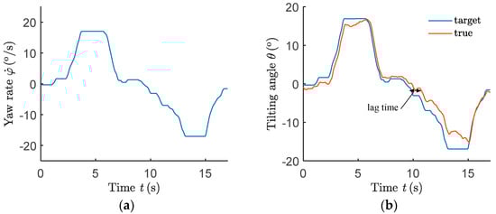 Lag time of true tilt angle with DTC: (a) yaw rate; (b) tilting angle.