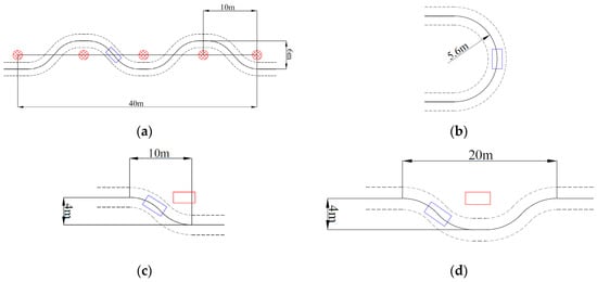 The route of the validation experiment: (a) the “S”-type route; (b) the “C”-type route; (c) the single lane change route; (d) the double lane change route.
