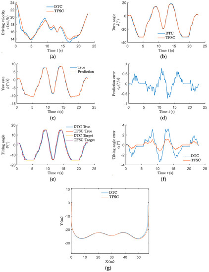 The experiment results of the “C”-type route: (a) driver input driving velocity; (b) driver input turn angle; (c) yaw rate; (d) prediction error of ; (e) tilting angle; (f) the error of tilting angle; (g) the trajectory.