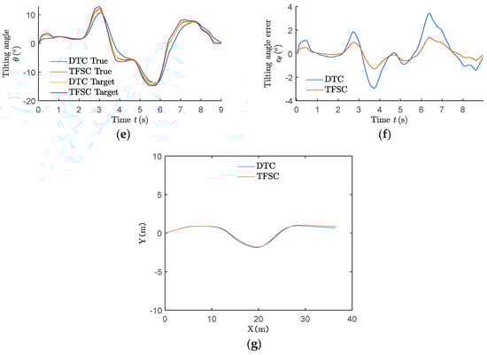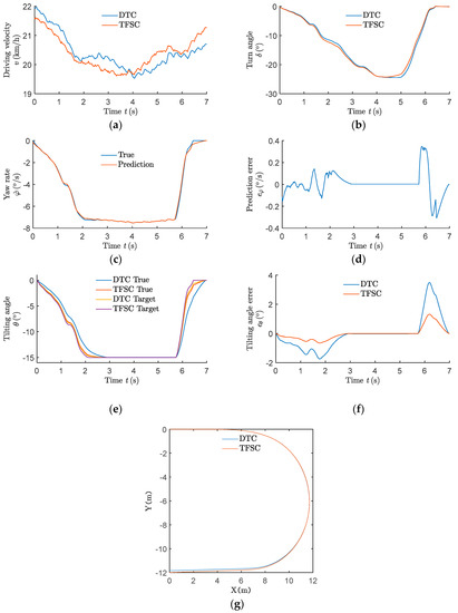 The data of the NTV prototype when driving in the double lane change route are shown in Figure 15. The true tilting angles of the NTV prototype with DTC and TFSC are compared with the ideal tilting angle.