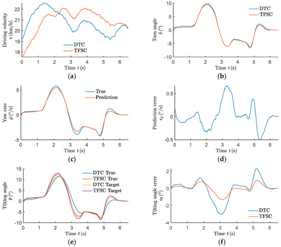 When the prototype drove in the double lane change route, the maximum absolute error of the prediction was 0.4492°/s, and the average absolute error was 0.1023°/s. The true tilting angle with TFSC was closer to the corresponding target [9]. The tilting angle error is shown in Table 4.