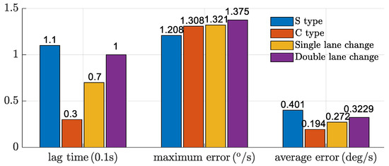 According to Table 1, Table 2, Table 3 and Table 4, the tilting motion performance under the control of TFSC was better than that of traditional DTC. The lag time in Table 1, Table 2, Table 3 and Table 4 can meet the performance requirements of vehicle suspension [33]. In the four typical scenarios shown in Section 4.1, Section 4.2, Section 4.3 and Section 4.4, TFSC reduces the average absolute error of the tilting angle by 65.9%, 63.8%, 54.7%, and 54.5%, respectively; TFSC reduces the average lag time of the tilting angle by 47.6%, 57.1%, 56.2%, and 44.4%, respectively. The tilting motion performances (e.g., average lag time, maximum absolute error and average absolute error of tilting angle) of TFSC under four scenarios were compared, and the results are shown in Figure 16.