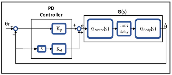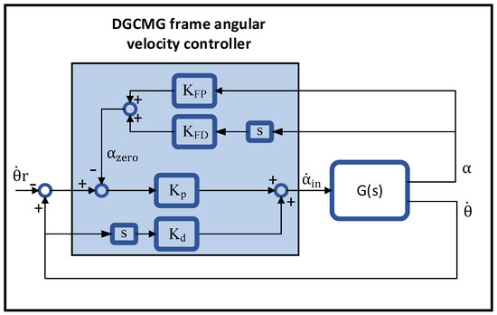 From Equation (5), it can be seen that SGCMG generates the maximum precession moment at , 0 at (singularity of SGCMG). Therefore, it is necessary to introduce a frame return to zero (frame singular avoidance) controller in the PD controller, the feedback loop equation of which is shown in Equation (31), so that the frame angle can be kept as close to 0° as possible at any time to maximize the effectiveness of the SGCMG and thus improve the impact resistance and stability of the vehicle body. The structure of the closed-loop system using the SGCMG frame angular velocity controller obtained from the above analysis is shown in Figure 8.