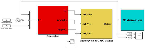 In this section, we present the design of SGCMG frame angular velocity control. The two-wheel motorcycle is a complex nonlinear system with static instability, and the relationship between the frame angular velocity and the roll angular velocity is mainly considered after the introduction of the SGCMG model, and the roll angle , the steering angle and the front and rear wheel linear velocities and are coupled as shown in Equation (26). In order to design the SGCMG frame angular speed controller, the nonlinear model of the two-wheeled motorcycle equipped with SGCMG needs to be simplified, and for this purpose we make the following assumptions: