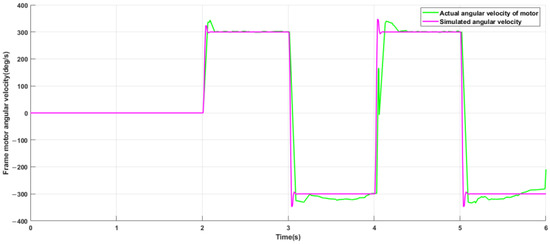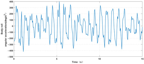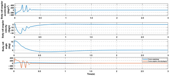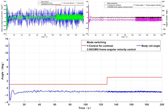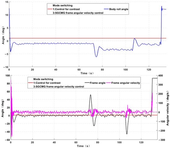 From the above figure, it can be seen that the of the car body changes more frequently and the amplitude of the car body is larger after switching the controller, which is due to the adoption of the roll angular acceleration feedback to improve the real time performance of the SGCMG frame angular velocity controller, resulting in a more dramatic control effect. Meanwhile, it can be found from the figure that the balance angle of the car body before and after the controller switching does not change, both are about −1°, and the SGCMG frame angular velocity controller does not define any parameters about the target roll angle, which is consistent with the simulation results, fully proving that the controller can control the car body to find the current balance angle in real time in practical applications. In addition, the above figure shows that there is no static difference between when the car body is moving around the equilibrium angle, which verifies the explanation of static difference in the above paper.