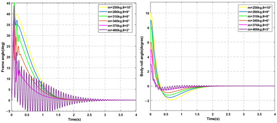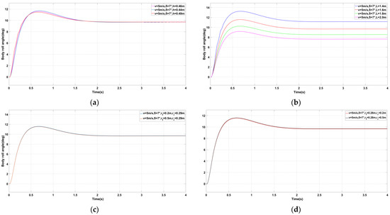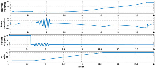 The above simulation results show that the SGCMG frame angular velocity controller is similar to the control of the instantaneous mass distribution of the “human-vehicle” system when a person rides a bicycle. For example, a racer in a small corner press at high speed mainly uses his body hanging to the side of the car body to make the system weight moment greater than the centrifugal moment to achieve the required roll angle for cornering. The human uses his own gravity to make the “human-vehicle” system move to the target balance state. The SGCMG frame angular velocity controller proposed in this paper replaces the weight moment applied to the vehicle body by generating the precession moment to control the movement of the vehicle body to the required roll angle for balance, which is in accordance with the motorcycle dynamics. The above simulation results also fully demonstrate the good robustness of the SGCMG frame angular velocity controller under various operating conditions for wheel speed variation, steering angle variation, acceleration variation, and external disturbance. However, it should be noted that the control effect of the controller depends on the performance of the SGCMG. As the precession moment generated by the SGCMG increases (frame angular velocity increases, rotor speed increases), the attitude change response, anti-interference ability, dynamic adjustment ability, and load capacity of the vehicle will be substantially improved.