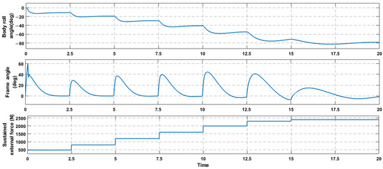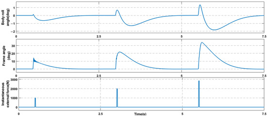 The fluctuation of the instantaneous impact applied at the center of mass perpendicular to the OXZ plane with time is given in Figure 16 for the state [] of the vehicle body at rest without steering and without an initial roll angle. Considering that the collision time in the actual working condition should be much less than 0.04 s, the instantaneous impact at the center of mass of the actual car body should be much larger than 2850 N, which shows that the angular velocity controller of SGCMG frame has good resistance to transient the instantaneous shocks.