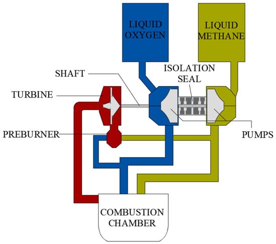 As a key performance component of a rocket-engine turbopump, the isolation seal between the fuel pump and the oxygen pump in the turbopump can prevent liquid oxygen, leaking between the shafts, from meeting with liquid methane and causing an explosion. A schematic diagram of a liquid rocket-fuel pump is shown in Figure 1. The isolation-seal system works on the shaft between the oxygen pump and the fuel pump. At present, rocket engines are gradually developing towards high-parameter requirements, with the requirements being: low temperature, high speed, high-pressure difference, and high vibration. This demands higher requirements for the sealing-performance and reliability of sealing systems [1]. An isolation seal will ensure the quantitative and stable circulation of the isolation gas, and the reliable stability of the seal under the rated working conditions.