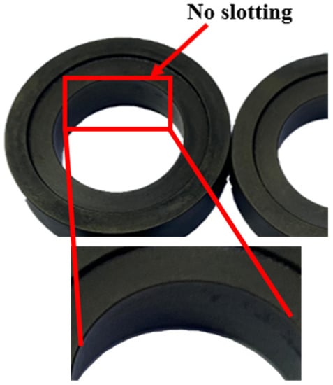 - After 600 h of the service performance test, the sealing system, with the inlet direction the same as the spindle rotation and no slotting on the main sealing surface, operated stably. In addition, the auxiliary sealing surface did not have violent friction. The seal system could not work stably and was accompanied by smoke when the directions were opposite to one another. Through observation of the auxiliary sealing surface of the seal, there were obvious scratches and friction marks, the end face was obviously gray, and the copper-metal color faded.