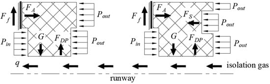 The inlet direction is tangential to the runway direction; when the seal is in operation, the forces are as shown in Figure 4. When the isolation gas-inlet pressure increases, the auxiliary sealing surface of the floating ring is close to the cavity, and the isolation gas flows on both sides in sequence through the primary and secondary floating-ring seal main-sealing channel. At this time, the auxiliary sealing surface is tightened and FA gradually increases, while frictional force Ff is generated. As the spindle rotates, the gas generates a buoyancy force, FDP, on the floating ring. When the buoyancy force (FDP) on the gas film is balanced with the frictional resistance (Ff) on the auxiliary sealing surface and the gravity (G) of the floating ring, the floating ring reaches a stable motion. The leakage channel is at the gap between the floating ring and the runway.