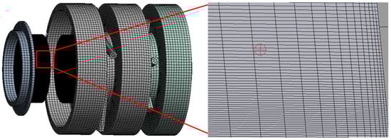 Since the numerical simulation of the flow field takes into account the influence of the fluid flow in the chamber before entering the floating-ring seal gap on the calculation, the turbulence model that was chosen was RNG k-epsilon. This turbulence model is more advantageous for high-speed flow and low Reynolds-number calculations. The standard wall function is used for the wall function. In addition, the energy equation calculation needs to be opened. Considering the grid complexity, the SimpleC calculation method was chosen.