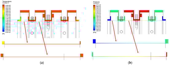 Finite-element analysis contour. (a) Temperature-field contour; (b) pressure-field contour.