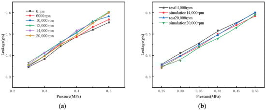 Through the principle test and finite-element simulation analysis, the variation-law of the leakage volume, with the increase in inlet pressure at different speeds and the same direction of inlet- and spindle-rotation, is shown in Figure 11.